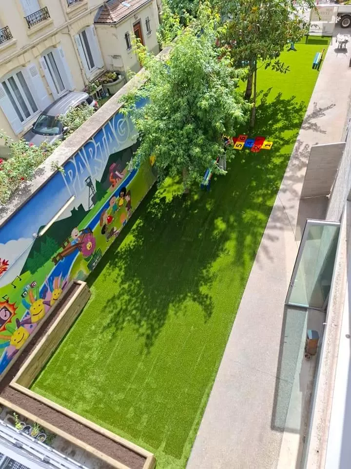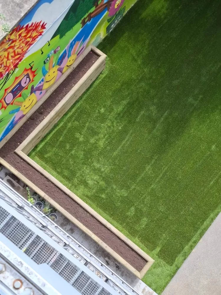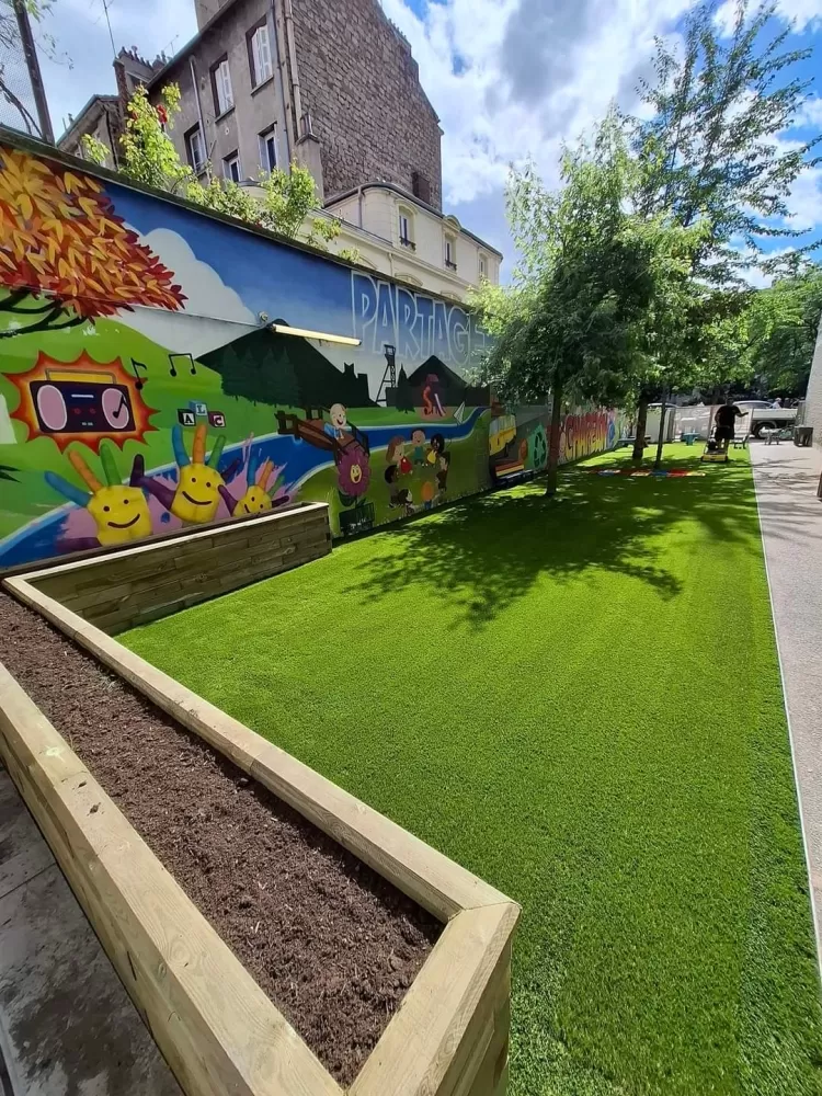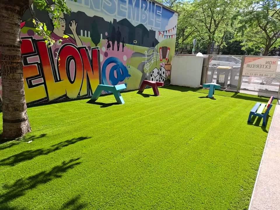Mon extérieur est intervenu pour l'Aménagement d'un extérieur en synthétique avec pose d'une jardinière dans une cour de jeux pour enfants à Saint-Etienne.
