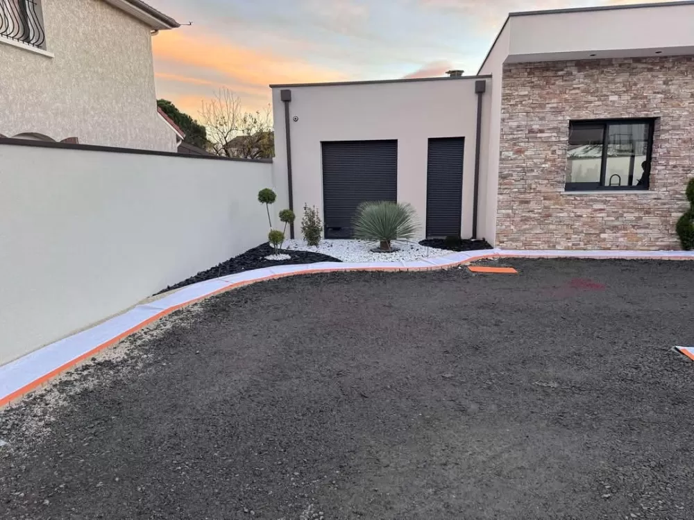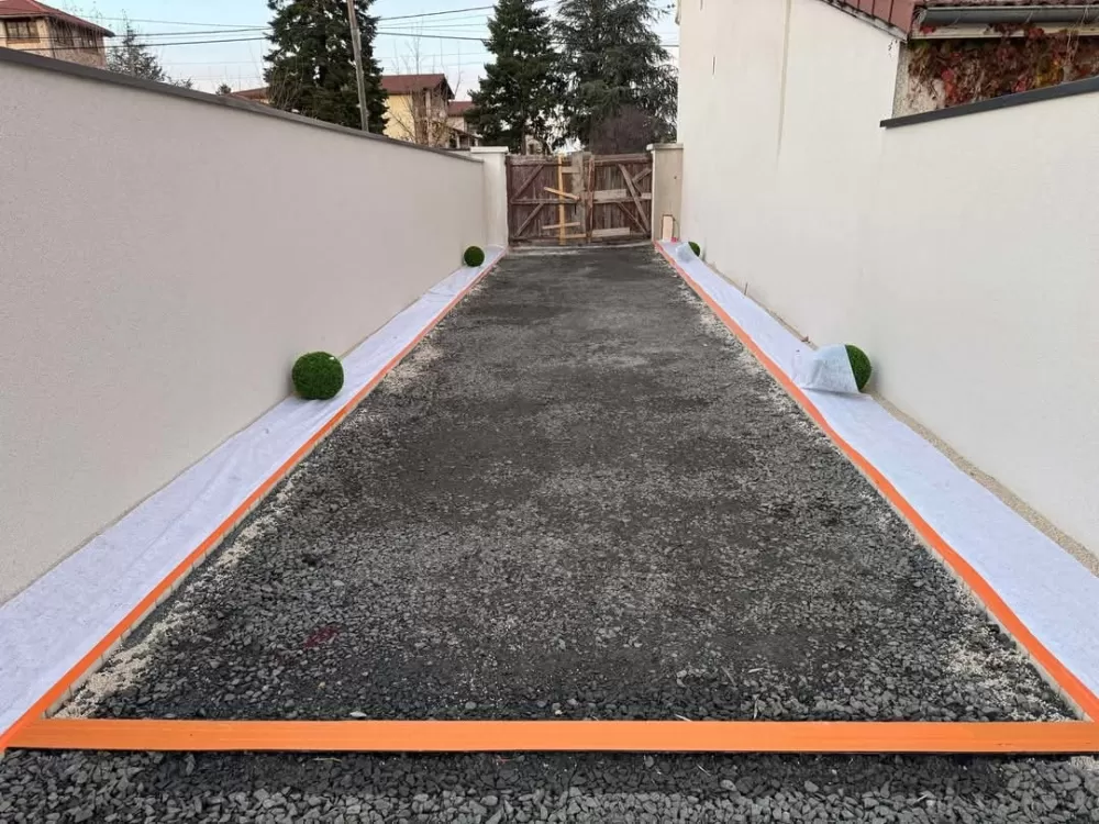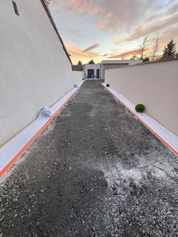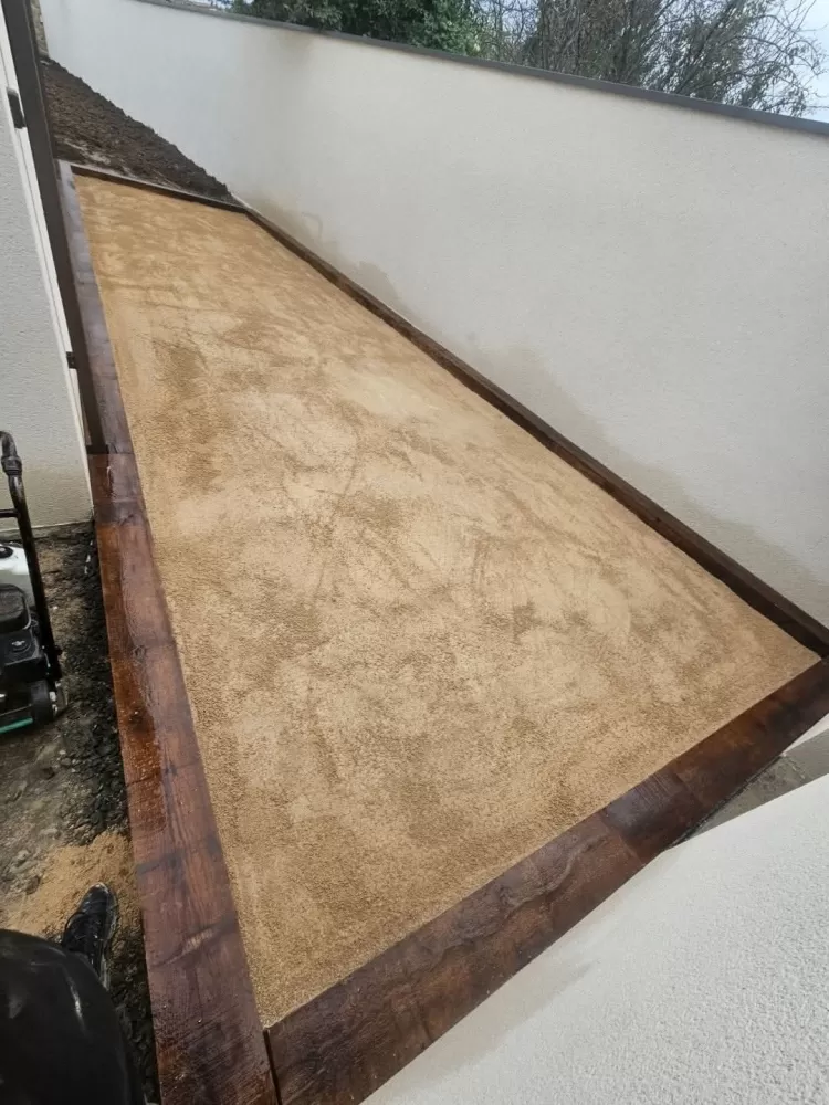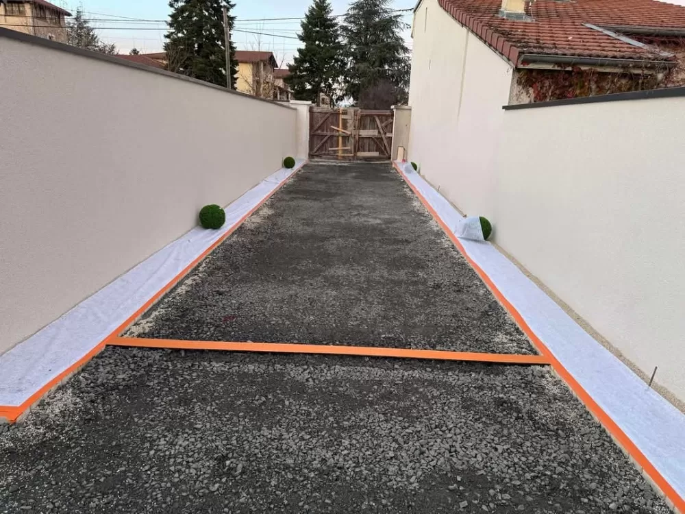Votre terrassier à Saint-Etienne à effectué le décaissement, la pose de géotextiles avec structure en 0,60 de carrières et nivelage en 31,5 de carrières avec compactage ainsi que la pose de caniveaux grilles suivi de l'application d'un enrobé noir 130kg/m² .Nous sommes aussi intervenu dans la réalisation d'un terrain de pétanque mais aussi dans la pose de pavés.