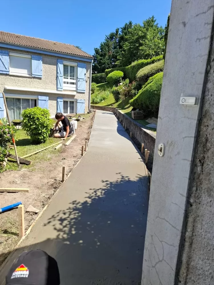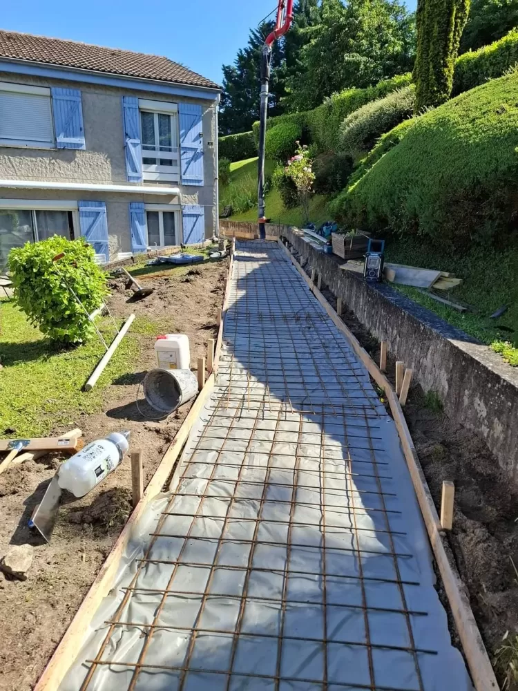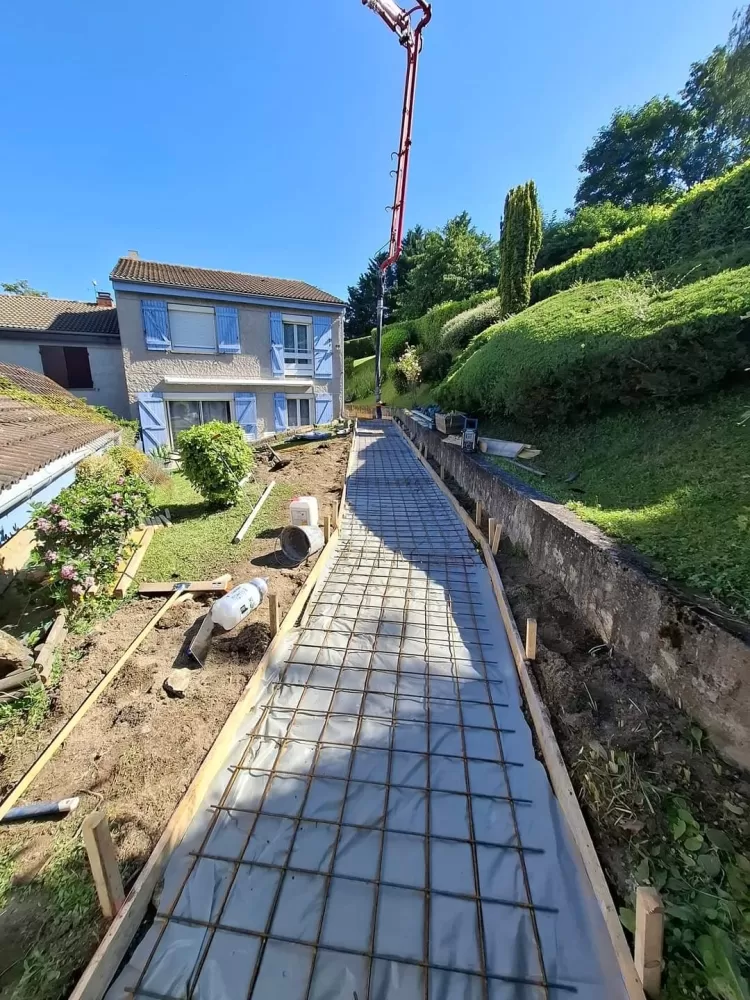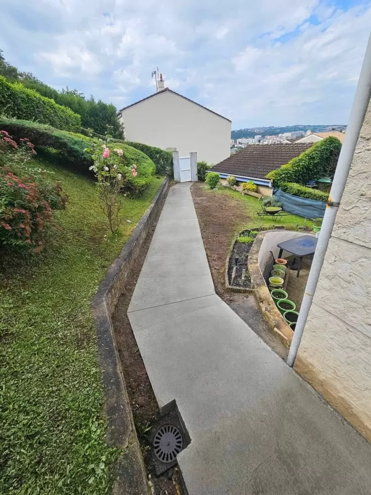 Mon extérieur est intervenu pour la création d'un chemin d'accès en béton balayer à Saint-Etienne. Votre terrassier à Saint-Etienne à effectué le terrassement suivis de son coffrage et ferraillage avant de pouvoir couler la dalle.