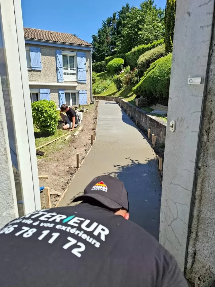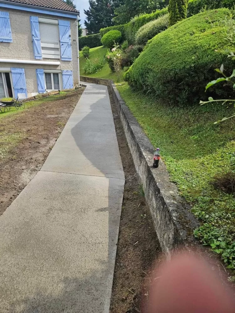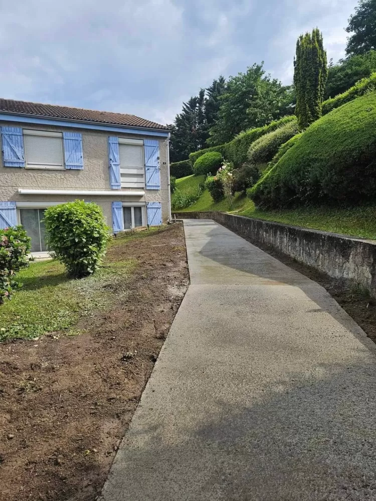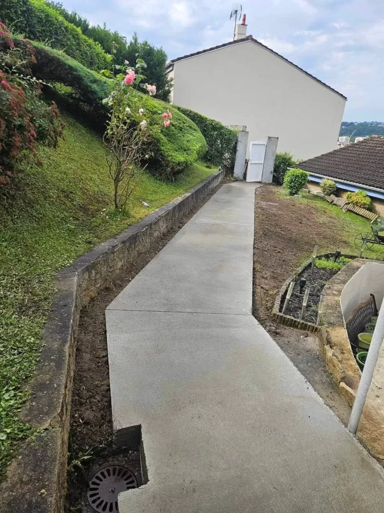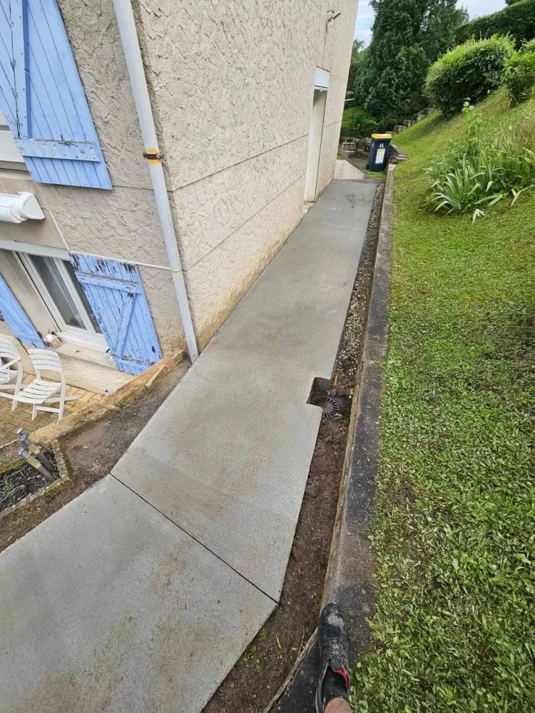 Mon extérieur est intervenu pour la création d'un chemin d'accès en béton balayer à Saint-Etienne. Votre terrassier à Saint-Etienne à effectué le terrassement suivis de son coffrage et ferraillage avant de pouvoir couler la dalle.