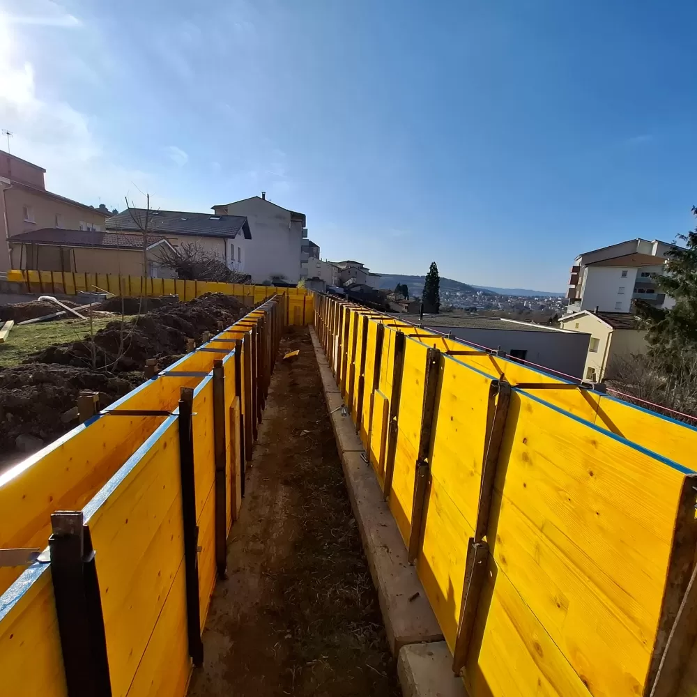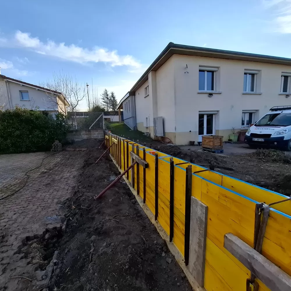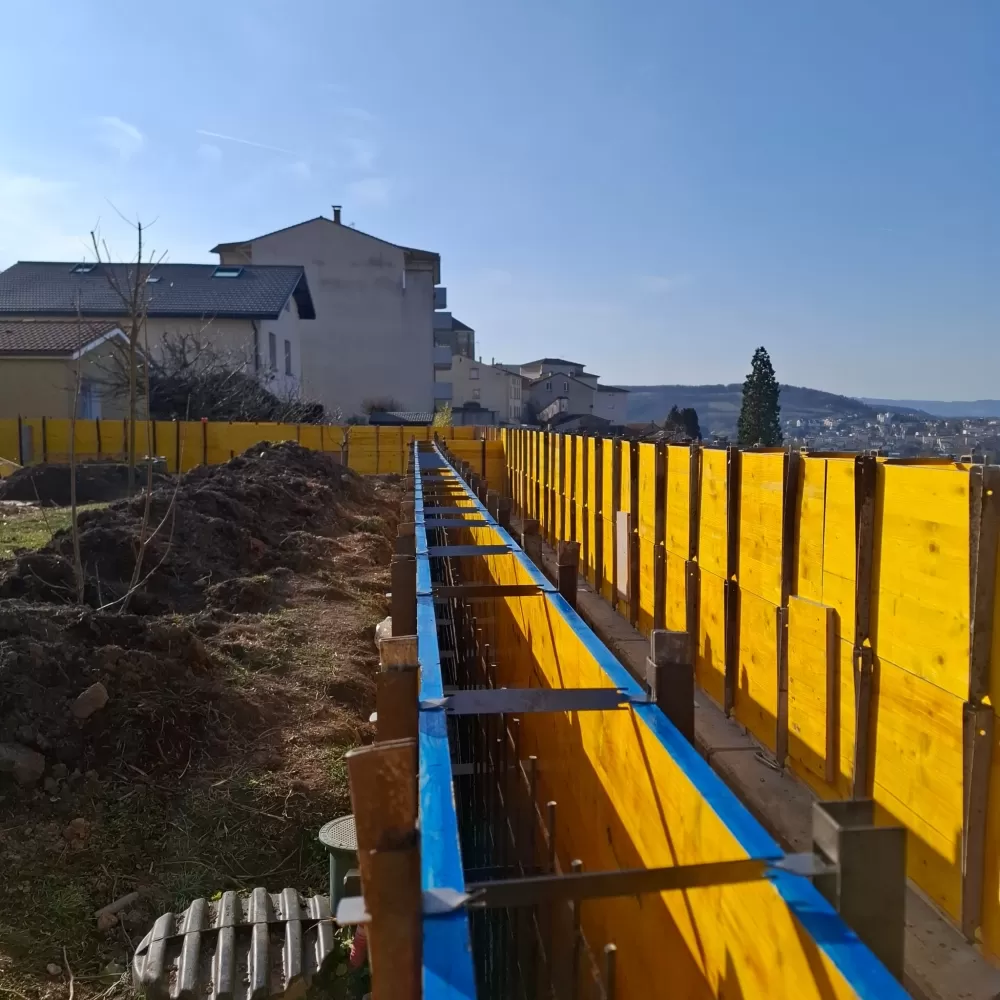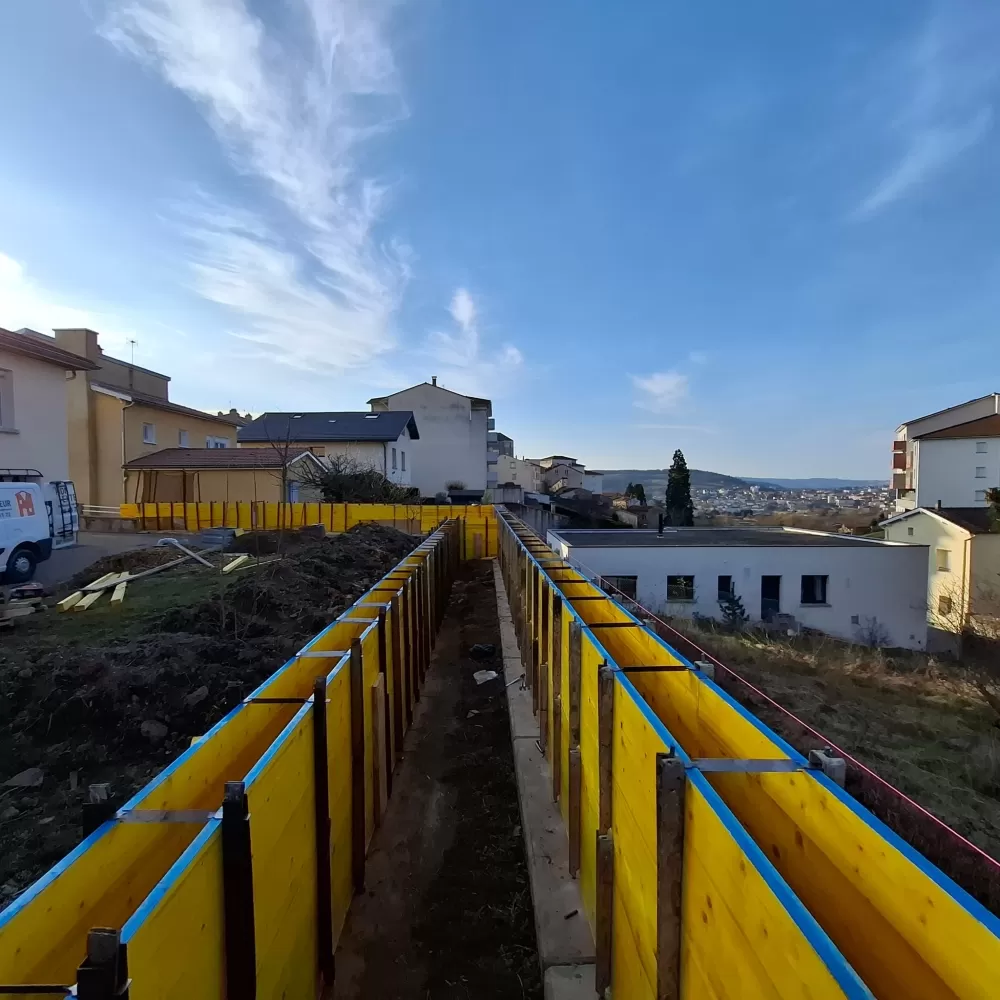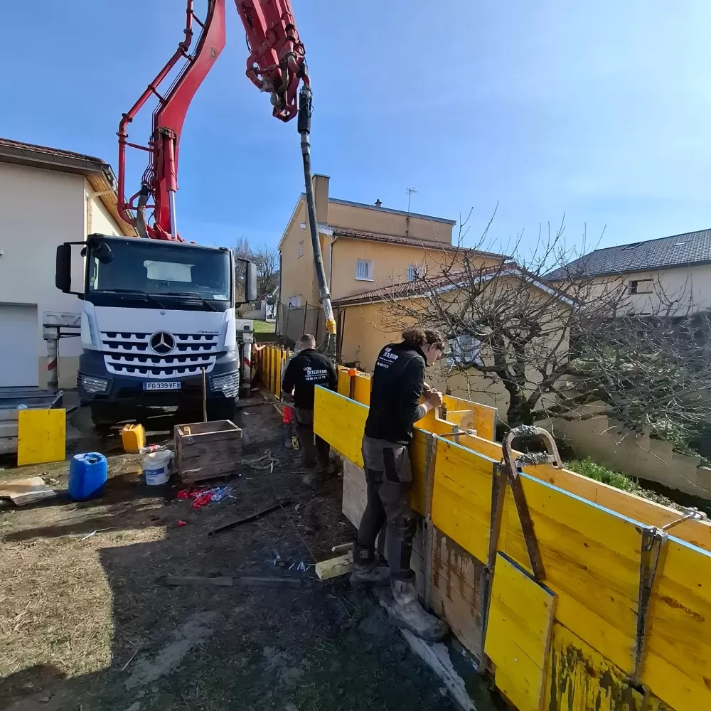 Votre maçon à Saint-Genest-Lerpt a effectué le coffrage et le coulage des ceintures en béton avec ferraillage 15/35 renforcé sur les murs existants en TOR de 12 ainsi que le scellement chimique